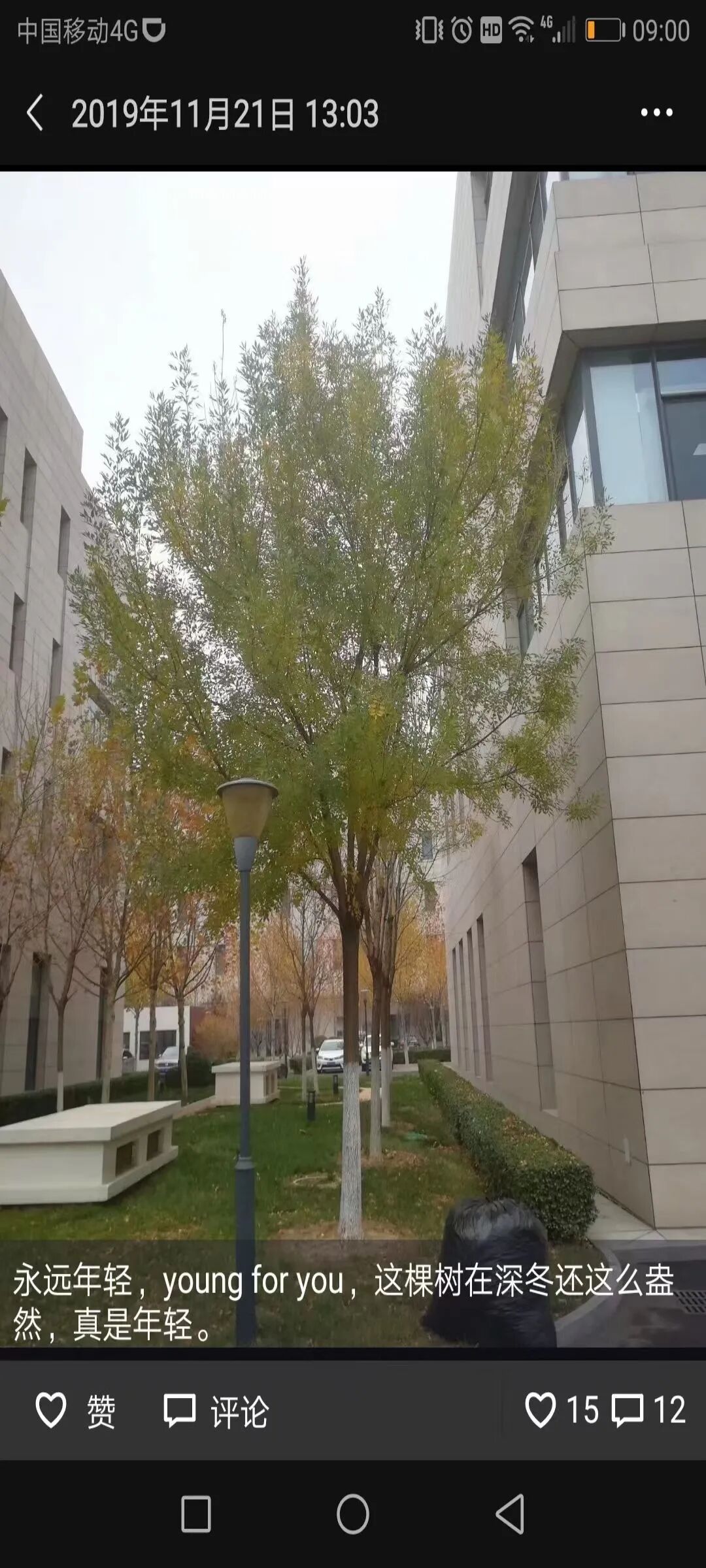 去年冬天,我就发现了这棵树,当时也是这种情况,其它树都已经落光了,它还是绿叶满树,我当时(2019年11月21日)发了一个朋友圈: