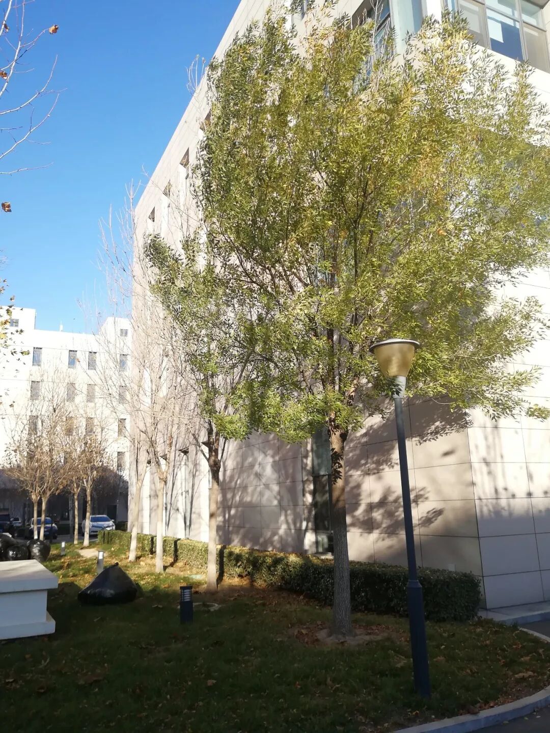 现在是2020年12月3号,地点是天津,公司附近的树枝都已经光秃秃了,我又看到了这棵树,这颗还是绿意盎然的树。
