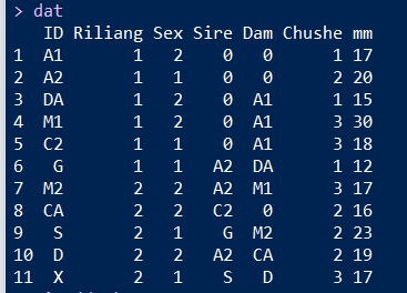 ID <- c("A1","A2","DA","M1","C2","G","M2","CA","S","D","X")Riliang <- c(1,1,1,1,1,1,2,2,2,2,2)Sex <- c(2,1,2,2,1,1,2,2,1,2,1)Sire <- c(0,0,0,0,0,"A2","A2","C2","G","A2","S")Dam <- c(0,0,"A1","A1","A1","DA","M1",0,"M2","CA","D")Chushe <- c(1,2,1,3,3,1,3,2,2,2,3)mm <- c(17,20,15,30,18,12,17,16,23,19,17)dat <- data.frame(ID,Riliang,Sex,Sire,Dam,Chushe,mm)dat