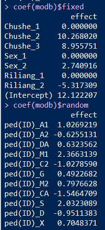 for(i in 1:6) dat[,i] <- as.factor(dat[,i])moda <- asreml(mm ~ Riliang + Sex + Chushe,random = ~ ped(ID),ginverse = list(ID = ainv) ,data=dat,start.values = T)t <- moda$gammas.tablet$Value <- c(2,3)t$Constraint <- "F"modb <- asreml(mm ~ Riliang + Sex + Chushe,random = ~ ped(ID),ginverse = list(ID = ainv) ,data=dat,G.param = t,R.param = t)summary(modb)$varcompcoef(modb)$fixeddim(ab)ab[8:18]coef(modb)$random