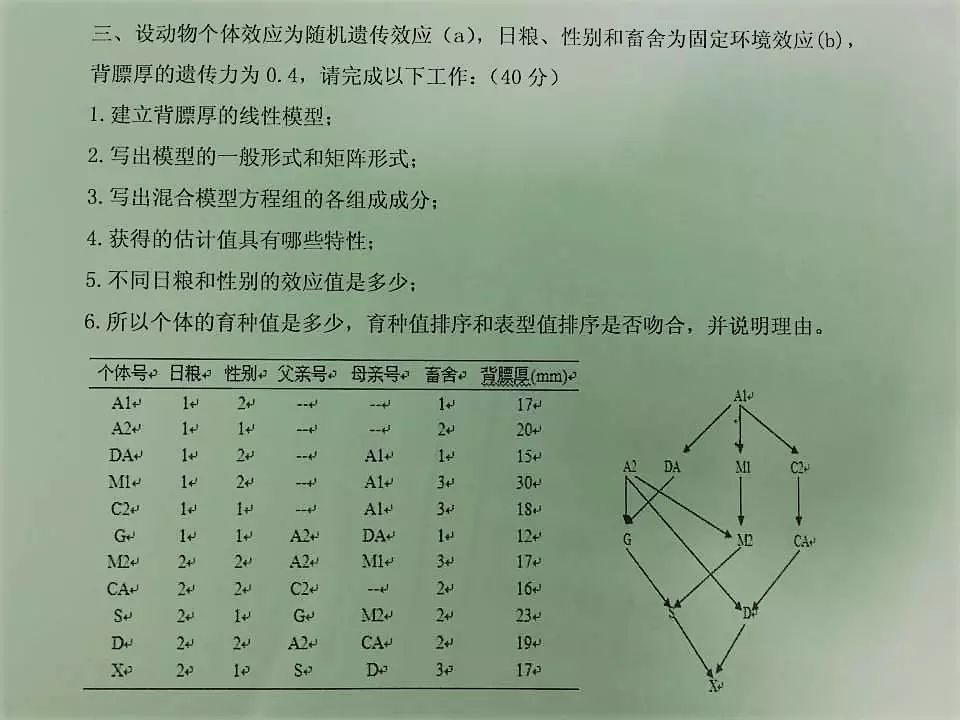 设动物个体效应为随机遗传效应(a),日粮、性别和畜舍为固定环境效应(b),背膘厚的遗传力为0.4,请完成以下工作: