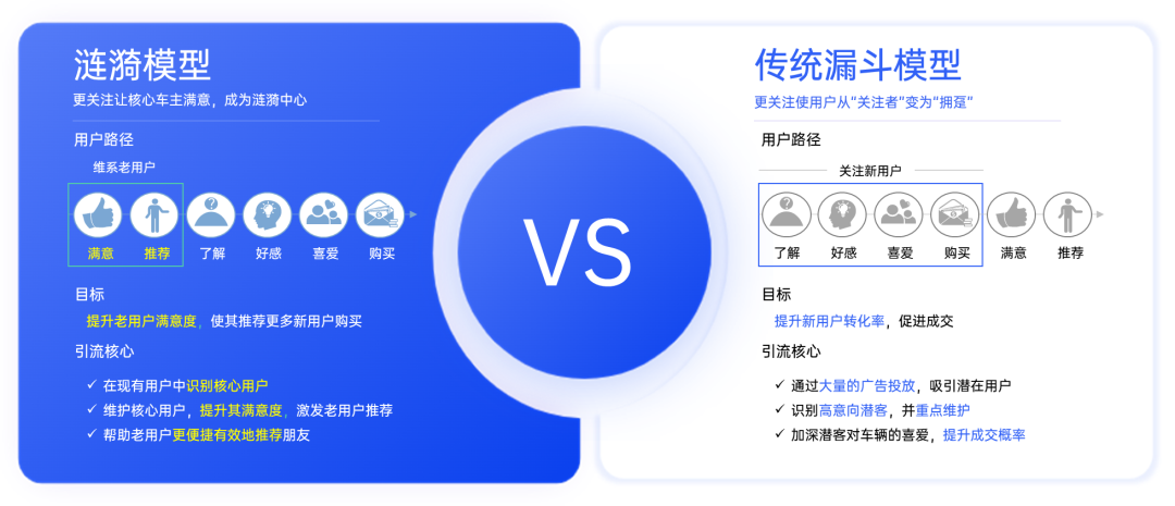 相较于传统品牌做营销大多是漏斗式的侧重点在用户从关注到成交这个过程,新势力车企正好是倒过来的,其侧重点在老用户满意-推荐给新用户这个过程,以“涟漪模型”形成了营销中的高效率。“涟漪模型”能够荡漾起来的最重要的一环是对核心老用户的维系,这样才能以此为起点不断将品牌影响力对外层层传播。
