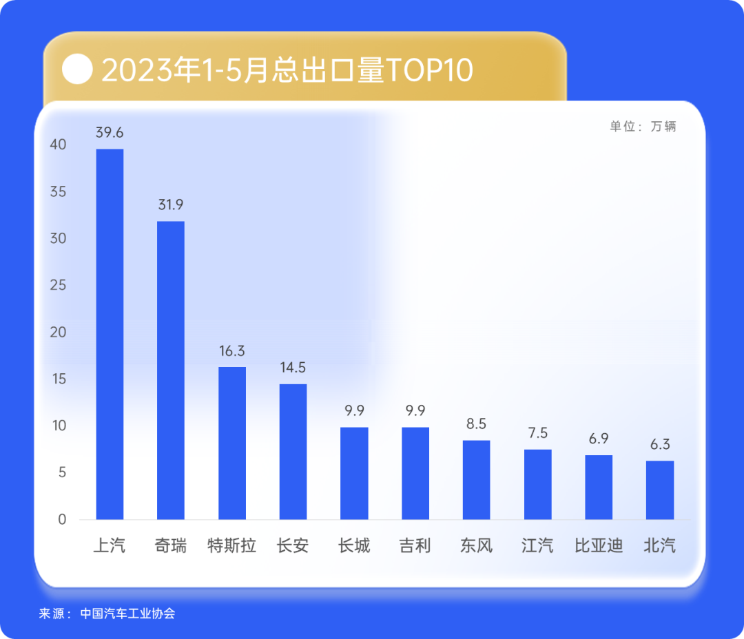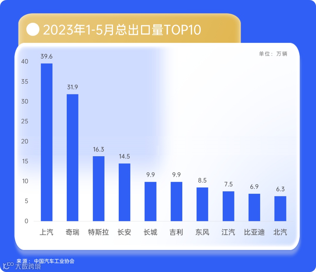 根据中国汽车工业协会数据显示,1~5月整车出口量前十的车企分别为上汽、奇瑞、特斯拉、长安、长城、吉利、东风、江汽、比亚迪和北汽。其中上汽整车出口数量最多,1~5月累计出口39.6万辆。而比亚迪出口增速最快,年内累计出口6.9万辆,同比增长14.2倍。奇瑞、长城汽车的出口增速也非常显著,分别同比增长1.8倍和1倍。