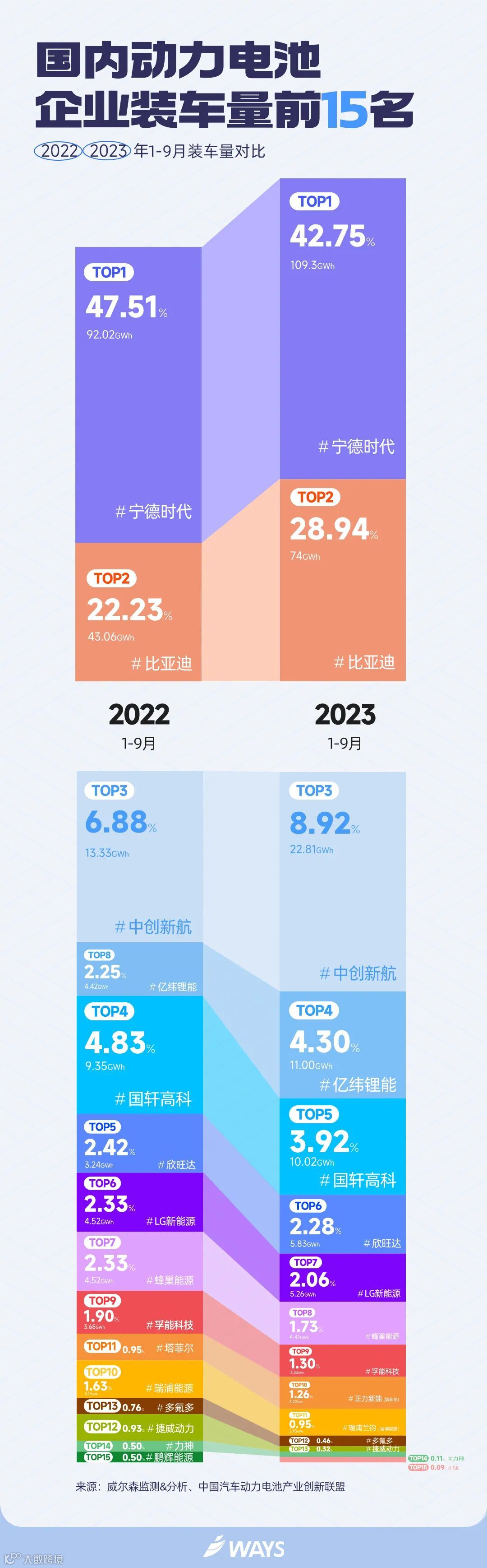 1-9月,我国动力电池累计装车量255.7GWh,累计同比增长32.0%。从国内动力电池企业累计装车量来看,宁德时代和比亚迪依旧位居前两位,市占率分别为42.75%和28.94%,随着越来越多车企出于供应链安全和成本考虑,选择二供、三供以及自建电池厂,车企们对宁德时代“依赖程度”已逐渐降低。虽然宁德时代仍然稳坐市占率第一的位置,但相较于比亚迪的同比去年增超6.7个百分点,市场份额却是从47.51%下降到了42.75%,其正面临着愈发猛烈且更为严峻的市场挑战和争夺。