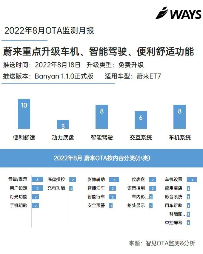继上月公测版之后,本月蔚来向ET7用户推送Banyan1.1.0正式版,该版本对ET7进行全方位升级,涉及座舱体验(语音交互、娱乐、UI、补能等)、智能驾驶,以及其它车辆控制功能,总计包含35项功能的新增和优化。