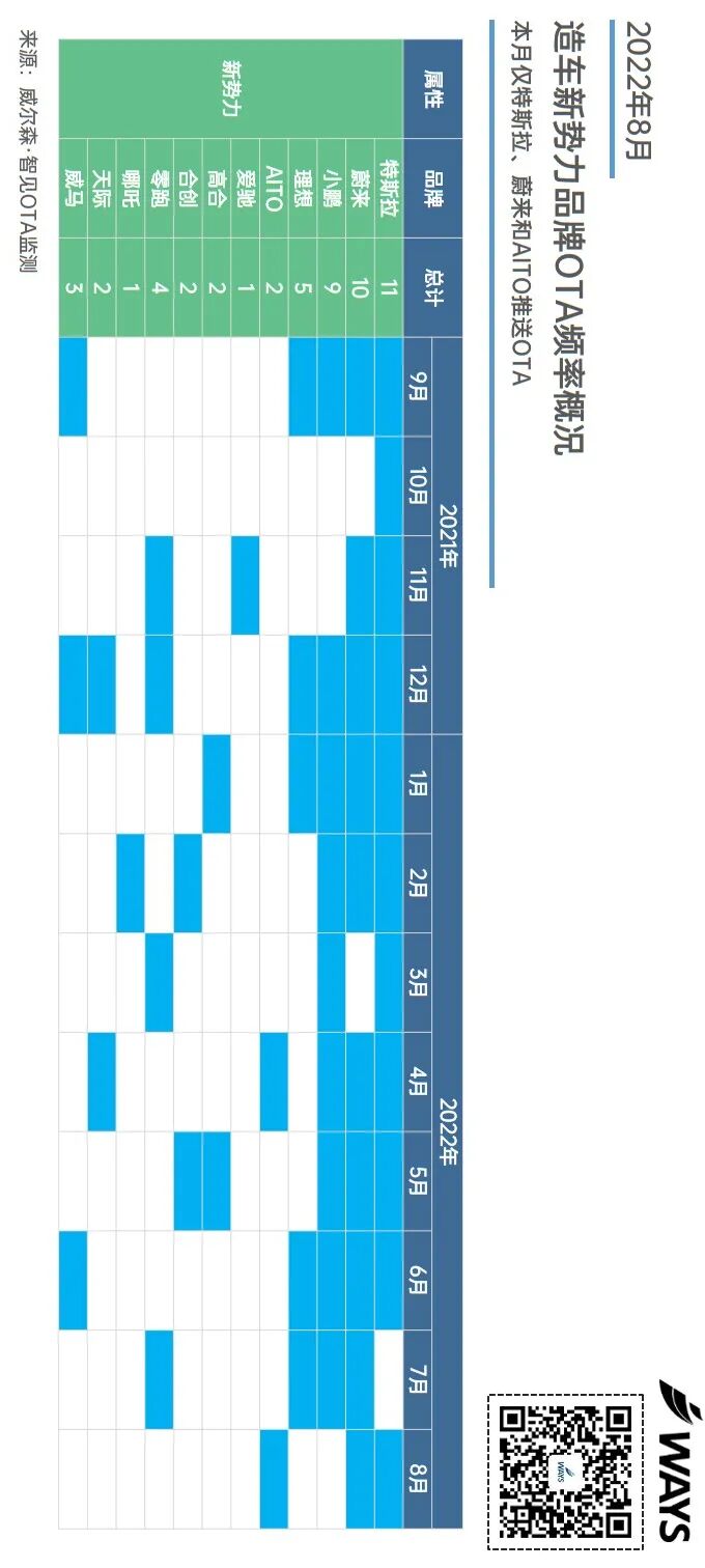 8月份新势力品牌共有特斯拉、蔚来和AITO三个品牌推送OTA,根据智见OTA监测数据显示,目前新势力在OTA升级上逐渐形成两种模式,一是以特斯拉和蔚来为首的“小步快跑”模式,另一种是降低升级频率,每次以重大版本形式推送的模式,比如这次的AITO问界M5。(↓趋势长图,横屏查看效果更佳)