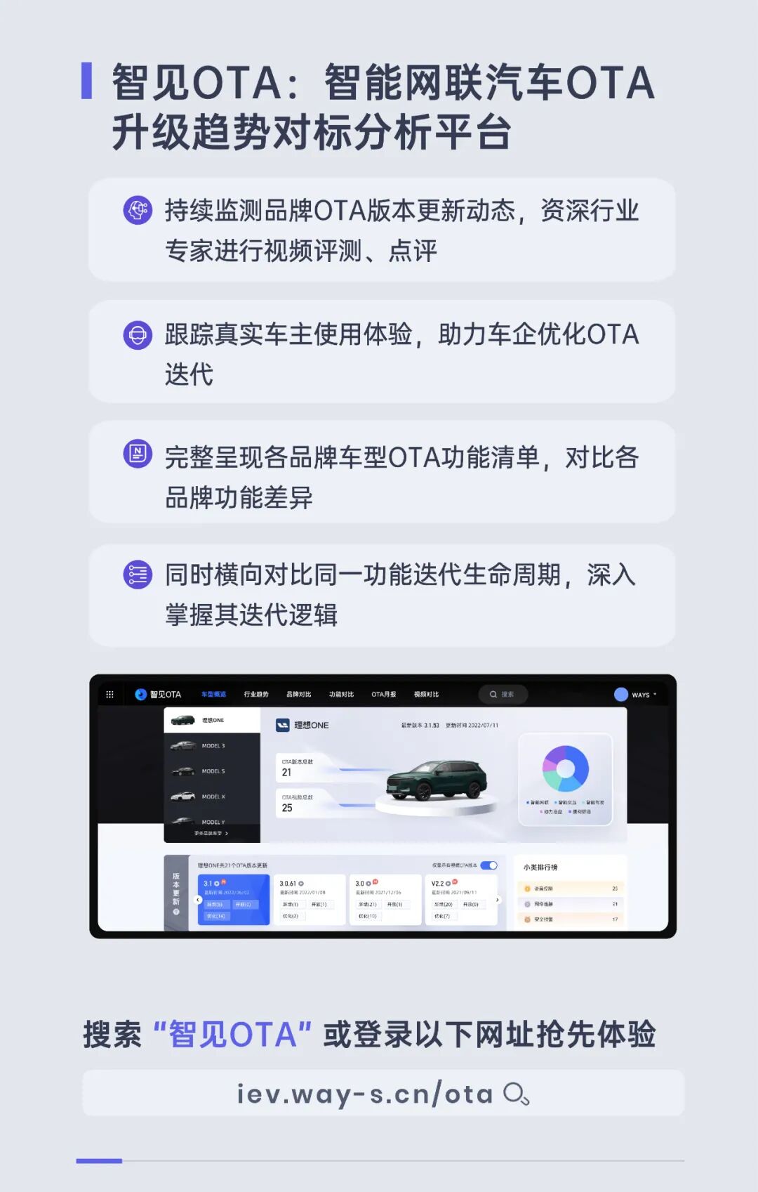 把握智能网联汽车OTA升级最新趋势,对比不同功能升级后效果,亦可以使用智能网联汽车OTA升级趋势对标分析平台——智见OTA,现在登录更享受15天免费试用期,点击文末“阅读原文”可以方便跳转,百度搜索“智见OTA”可以找到。