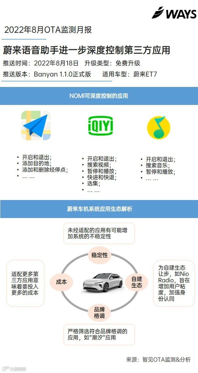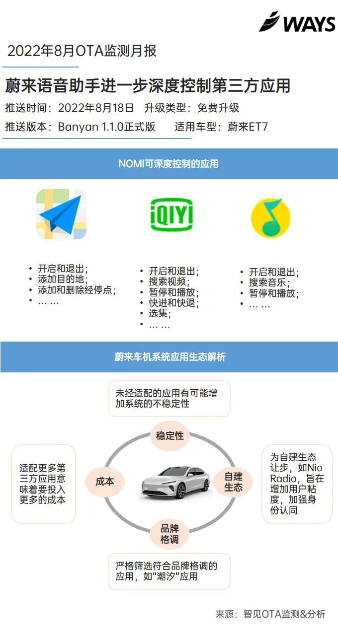 本月值得关注的是,蔚来新增了“NOMI对爱奇艺视频的搜索与播放控制能力”。由于蔚来车机属于半封闭系统,导致第三方应用较少,因此更容易推行语音助手对第三方应用深度控制,一个高度智能的AI助手必然要健全此领域能力。