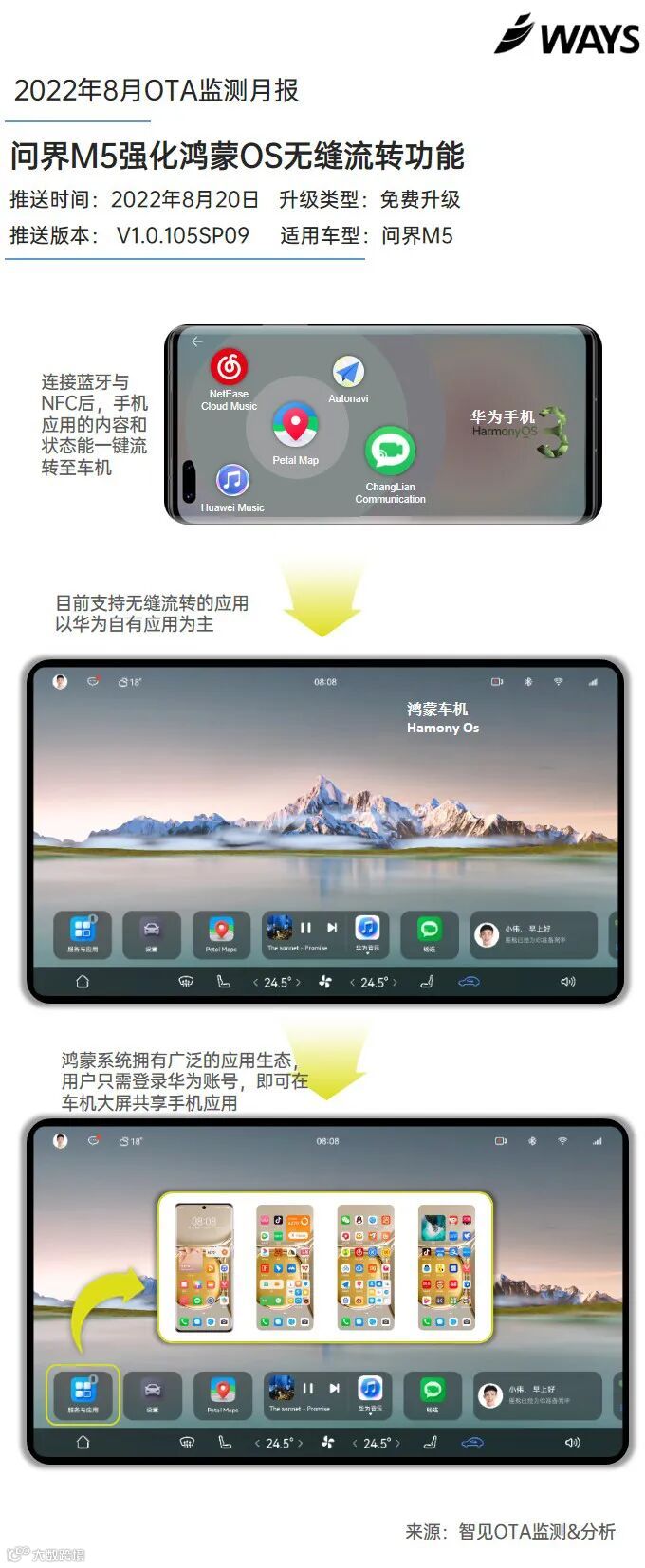 鸿蒙系统无缝流转功能相较一般车机互联,更能将手机应用的内容和状态一键流转至车机,如导航状态、播放音乐等,能够带来多终端无缝衔接的使用体验,也是余承东强调“真正的鸿蒙智能座舱”的一大表现。智见OTA监测显示,相关功能用户口碑不俗。