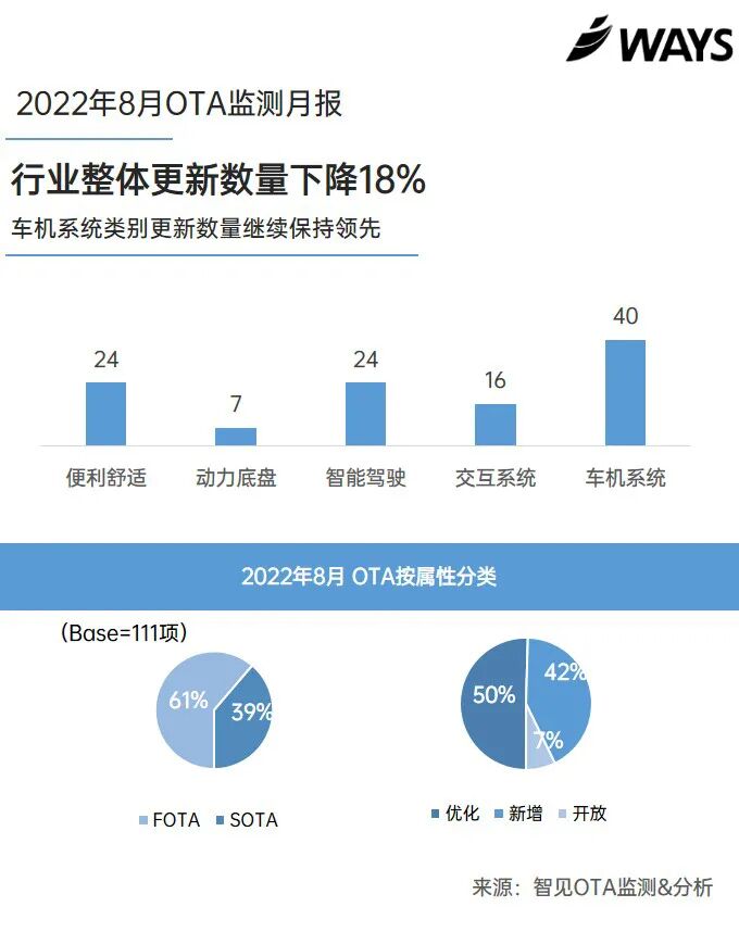 智见OTA监测显示,2022年8月,国内智能网联汽车通过OTA升级更新111项功能,相较上月的136项更新下降了18.4%。内容分类来看,车机系统为40项,继续领先其他类别——车机系统2022年的8个月里更新数量均保持领先。