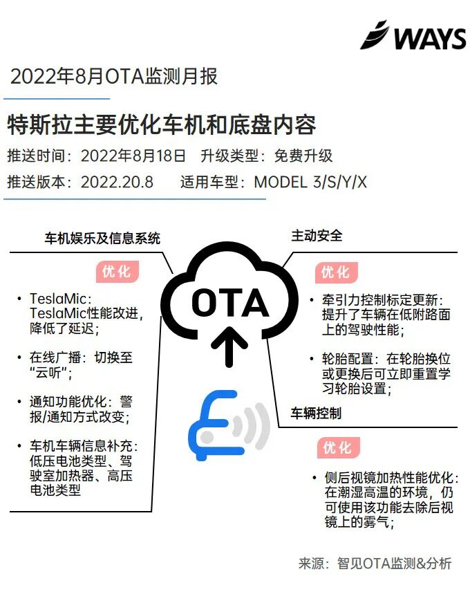 8月份特斯拉推送OTA以优化为主,在车机系统方面引入了云听在线广播和增加了车辆信息显示;在动力底盘方面优化了牵引力控制系统,让驱动力分配更加合理,加强低附着路面的行驶稳定性。