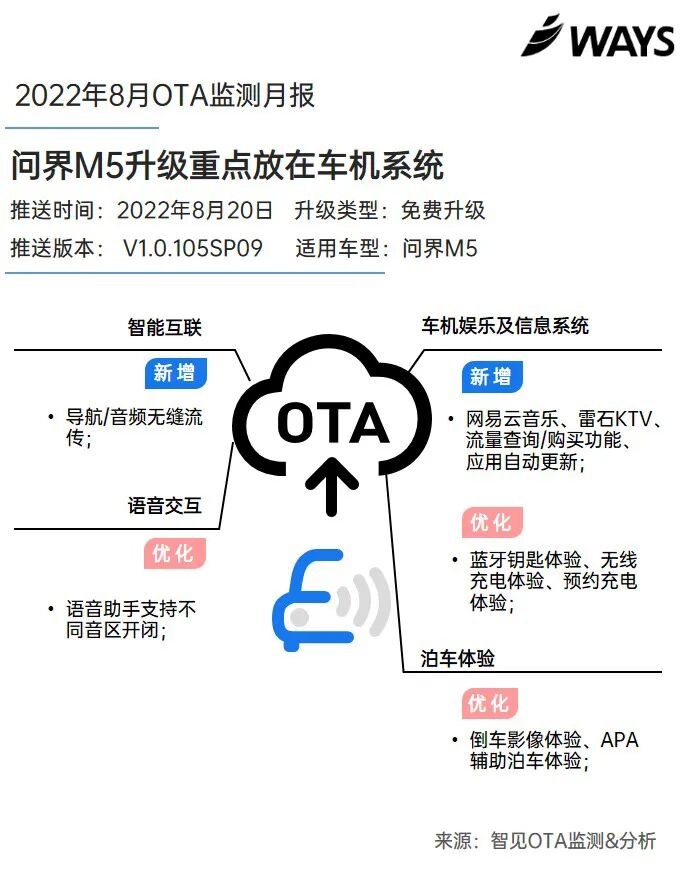 时隔四个月后,问界M5再次推送OTA,新版本为V1.0.105SP09,适用问界M5。本次升级重点放在车机系统上,升级内容大部分与应用相关,也紧跟新势力潮流推出了车载KTV功能;智能驾驶方面重点提升泊车辅助体验。