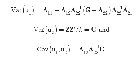 A is the numerator relationship matrix based on pedigree. Consider three types of animals in u: 1) ungenotyped ancestors with breeding values u1; 2) genotyped animals, with breeding values u2 (no ancestor is genotyped and phantom parents can be generated if necessary); and 3) ungenotyped animals with breeding values u3, which might descend from either one of the three types of animals.