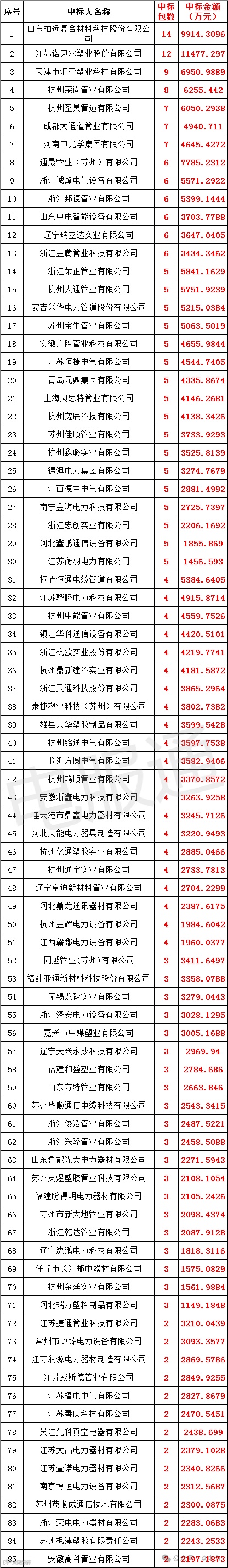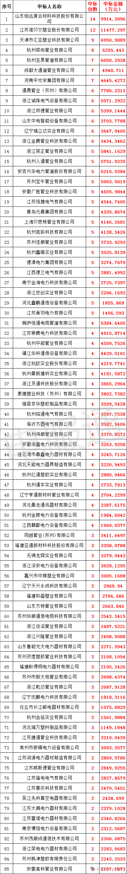 中标包数排名前三的是:山东柏远复合材料科技股份有限公司14个标包,江苏诺贝尔塑业股份有限公司12个标包,天津市汇亚塑业科技有限公司9个标包;