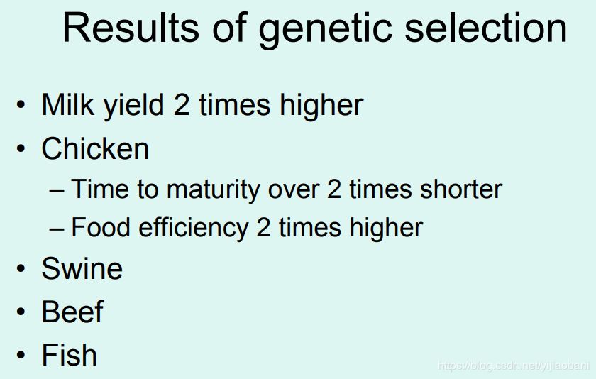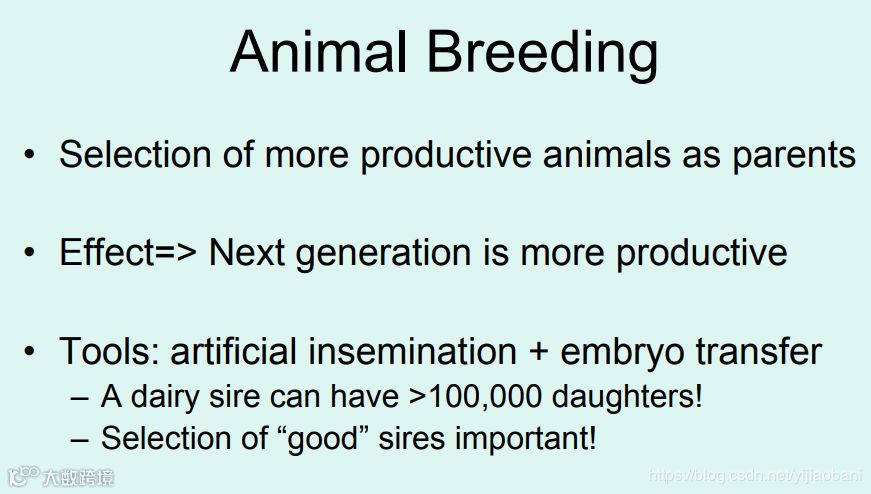人工受精和胚胎移植在动物育种中广泛应用,一个公牛可以有超过10万个雌性后代(奶牛)。工业化养殖(牧场, 养猪场, 农作物机械化)时代,育种的效益更加明显,任何细节的优化,效率的提升,放大规模后都会产生显著的效益。