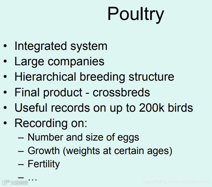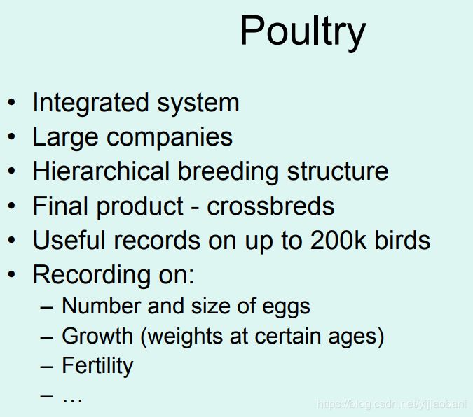 家禽育种,特别是鸡育种,规模非常大,而且分层育种结果,比如三交种,五交种。最终使用的是最后的杂交种,一个个体有效的记录可以追溯20万只鸡,考虑各种经济性质比如产蛋,肉质等等。