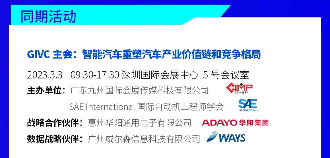 GIVC全球智能汽车大会及展览会将于2023年3月3日至5日,于深圳国际会展中心(宝安新馆)举办,大会聚焦于汽车前装科技,为全行业搭建新时期、新阶段智能汽车产业重要的信息、新技术发布及交流平台。威尔森及九州国际诚邀各位同仁、专家、媒体到场,共话智电车产业链发展方向。
