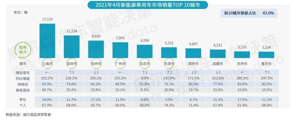 4月,前10城市销量占比为43.0%;大部分限牌城市销量排名靠前;上海市销量遥遥领先,稳居第一;重庆市跻身榜单第十。