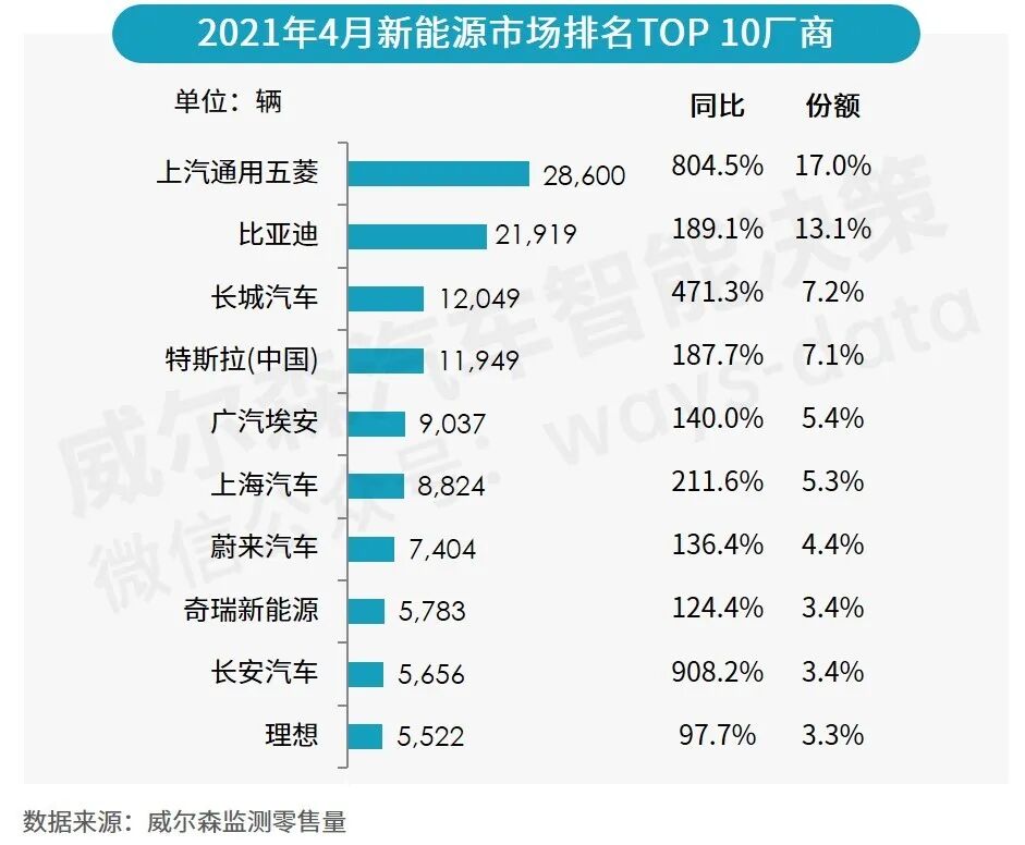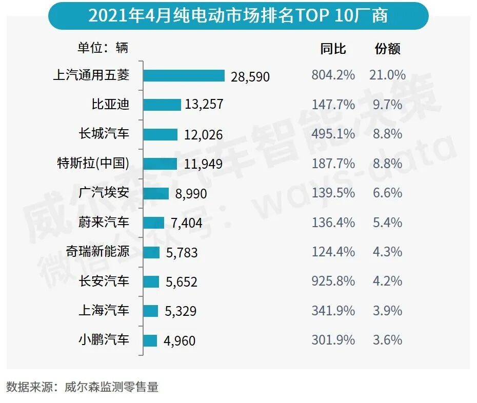 4月,新能源市场前10厂商市场份额约为69.5%,上汽通用五菱、比亚迪和长城汽车分列前三;特斯拉份额占比为7.1%,排名降至第四。