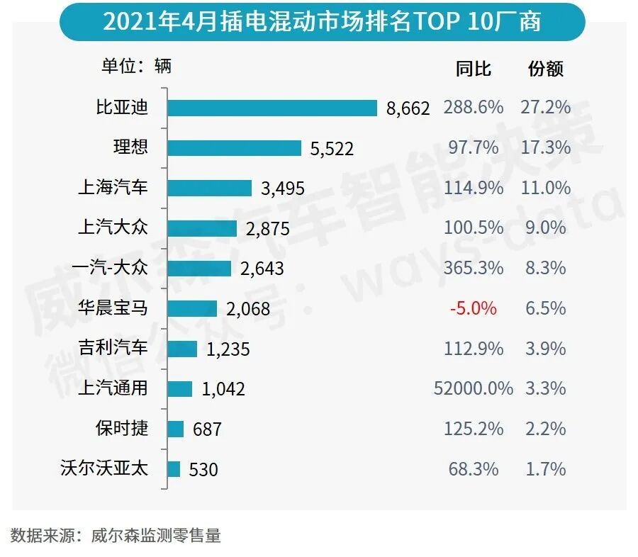 厂商方面,4月插电混动市场前10厂商市场份额约为90.4%;比亚迪、理想、上海汽车位列前三,保时捷升至第九。