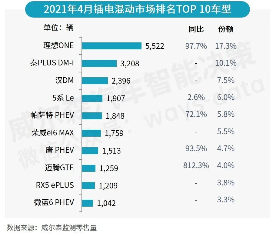 车型方面,4月理想ONE销量继续领先,稳居榜首;迈腾GTE下降6位,降至第八;3月上市的秦PLUS DM-i销量大好,跃居第二。