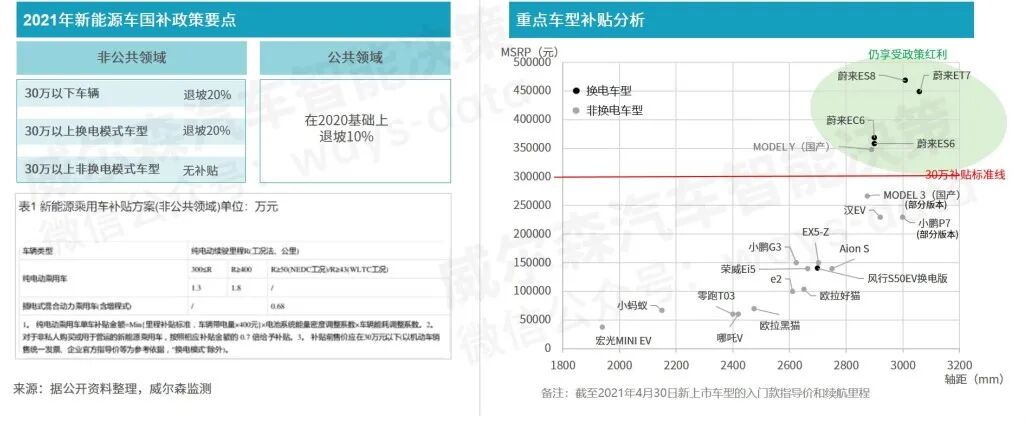 2020年12月31日,财政部、工业和信息化部、科技部、发展改革委联合发布《关于进一步完善新能源汽车推广应用财政补贴政策的通知》,新能源乘用车补贴前售价须在30万元以下(含30万元),“换电模式”车辆除外,于2021年1月1日正式施行。