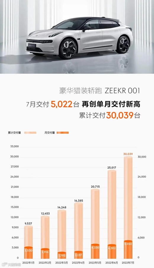 极氪001 7月交付5,022辆,再创该品牌单月交付新高,同时这款车本月话题热度也堪称爆表——极氪花3亿元为老车主更换8155芯片,车主无需付费,此举极大拉升了车辆话题度和品牌好感度。