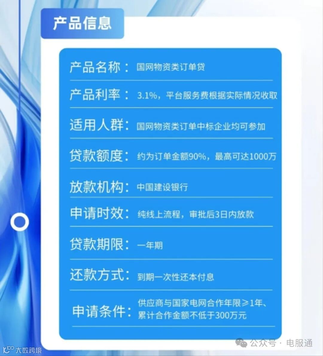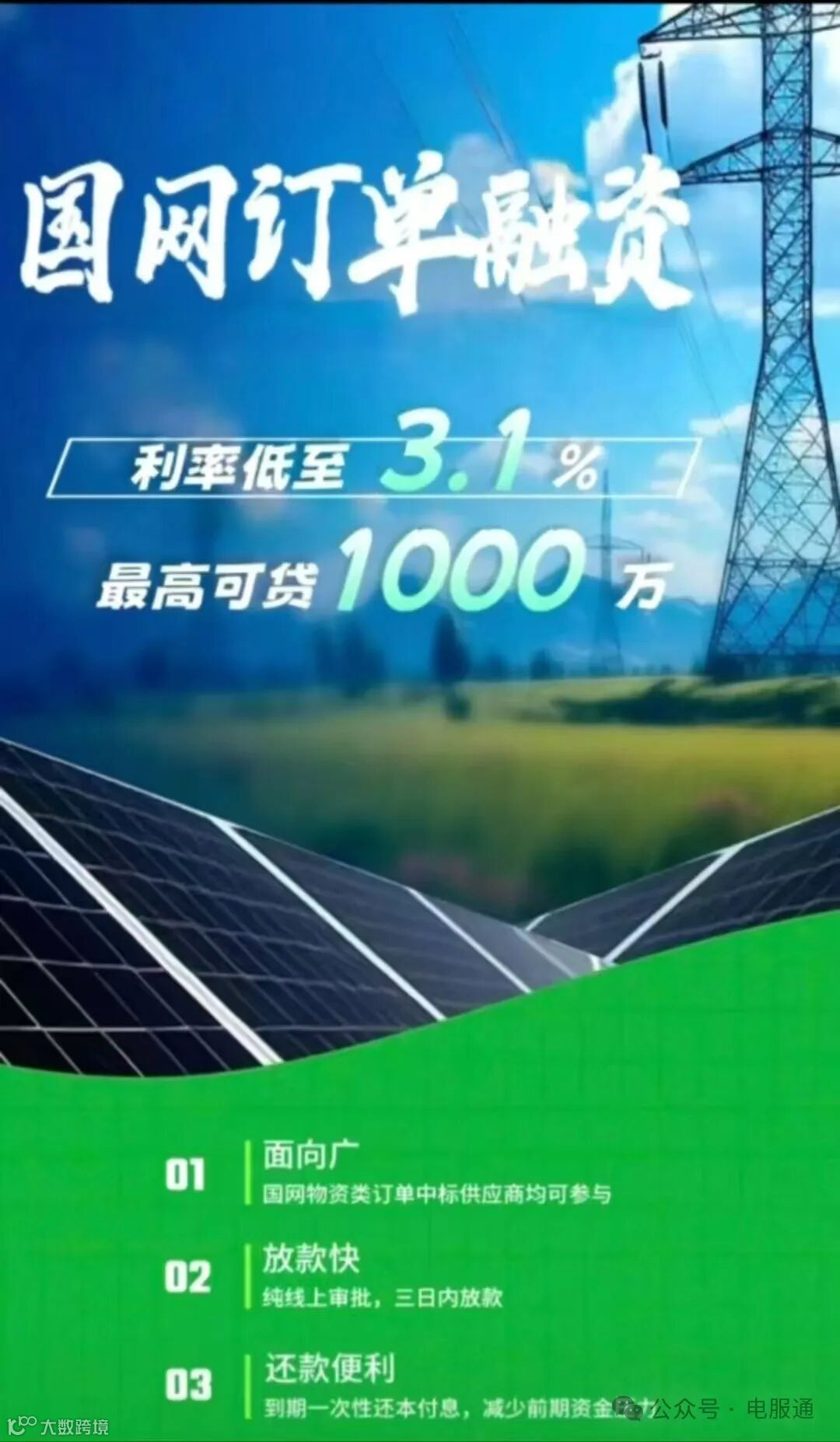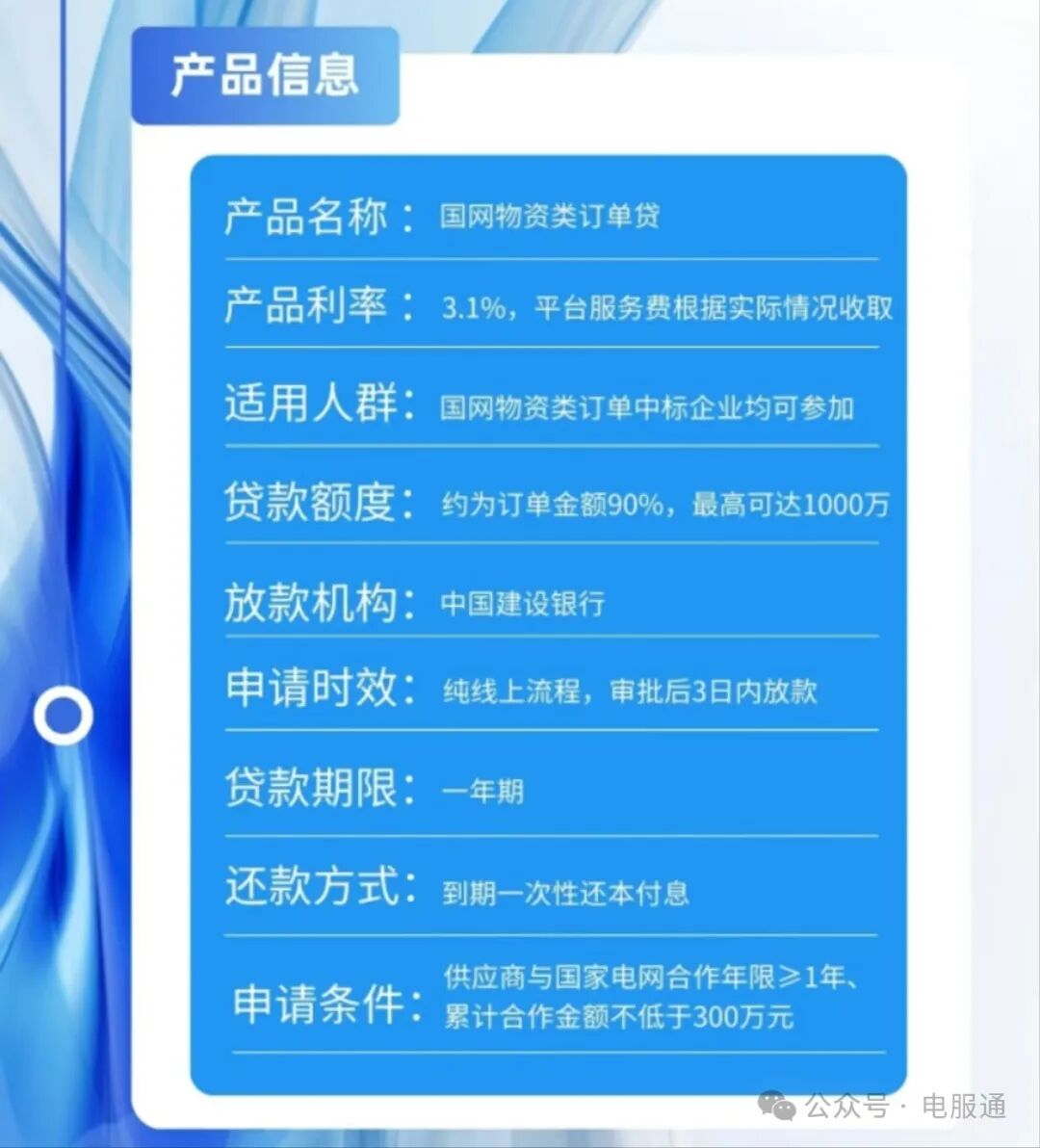 3、额度高:约为订单金额90%,最高可达1000万。**公司作为国网的长期合作伙伴,完全符合该产品的申请条件: