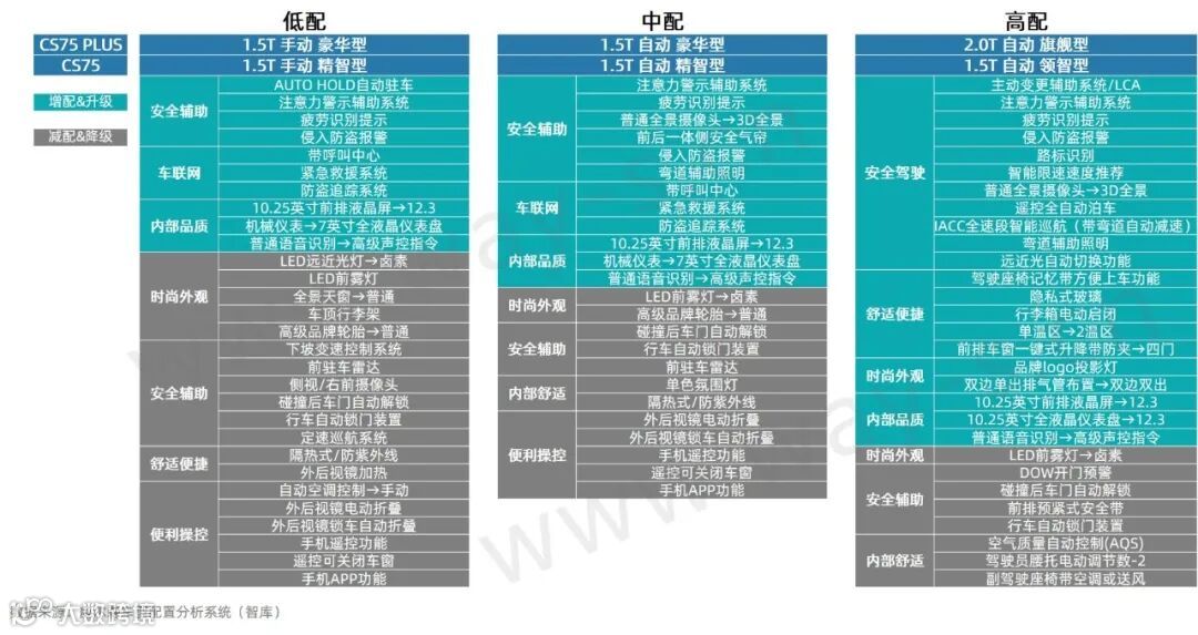 从具体配置梯度看,CS75 PLUS中低配已满足出行需求,高配科技智能亮点突出 。