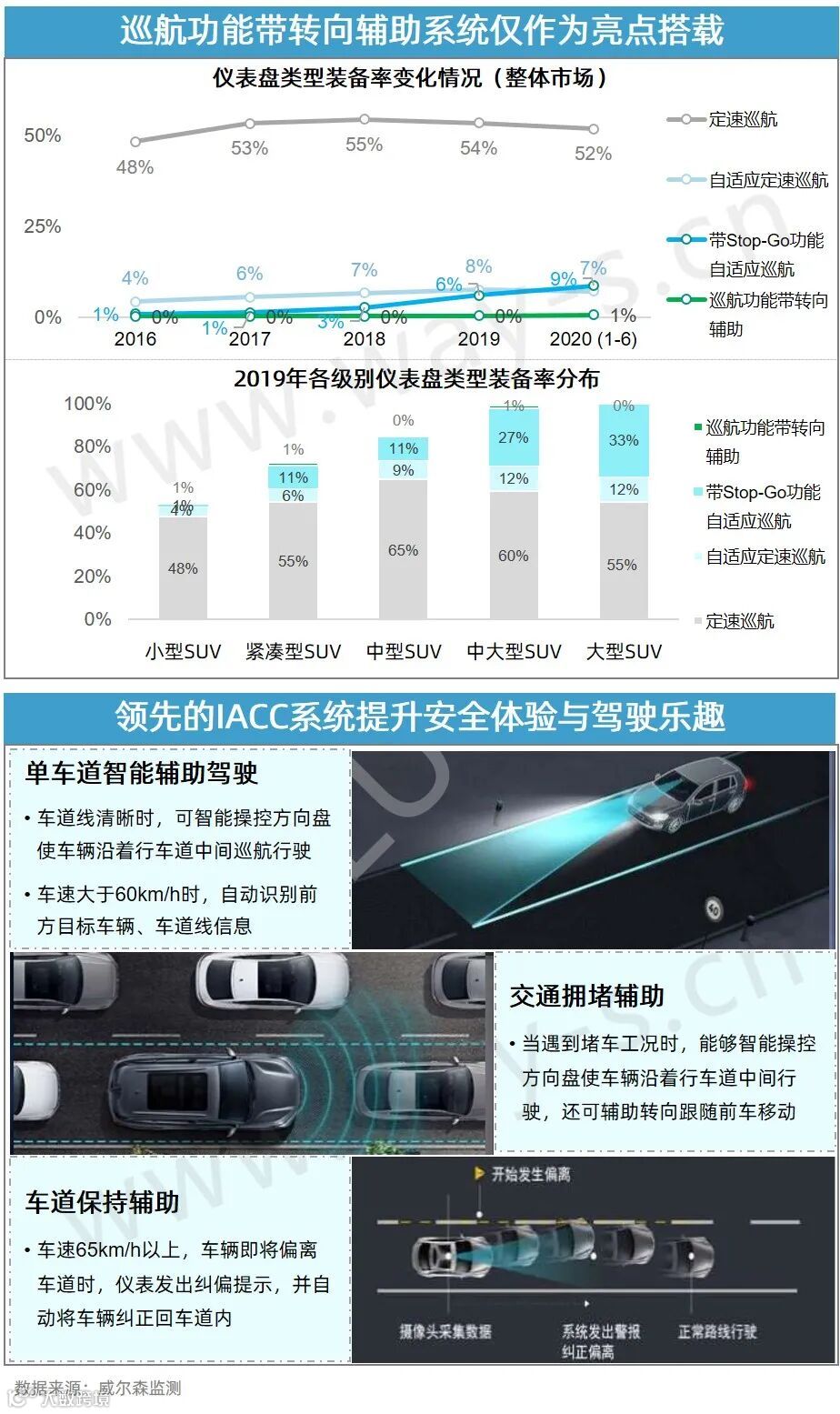巡航系统在SUV市场布局仍以定速巡航为主,巡航功能带转向辅助系统目前仅作为宣传亮点搭载于少辆车型的顶配型号,CS75 PLUS配备的该项功能配置是其一大产品亮点,加强了产品竞争力的同时有效提升产品形象。