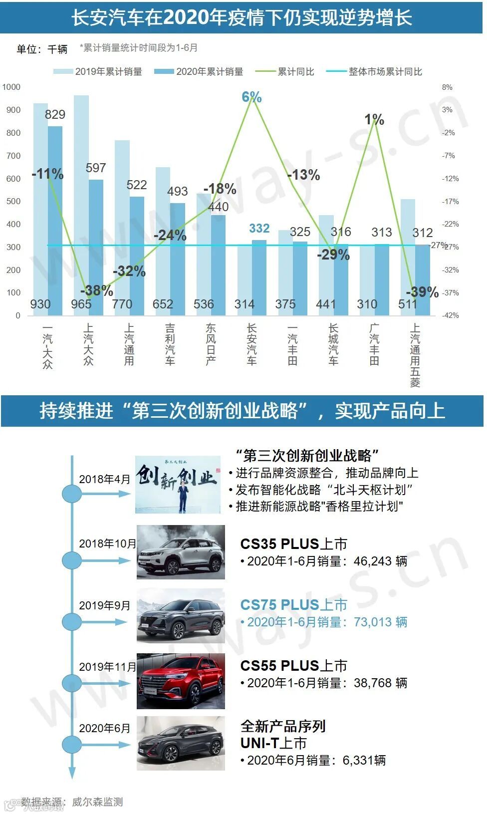 2018年以来车市已开始出现疲态,加之2020年初的疫情冲击,整体汽车市场出现明显萎缩。长安汽车持续推进“第三次创新创业战略”,整合品牌资源、推动产品向上,并在寒冬中站稳了脚跟,2020年上半年销量实现逆势增长,1-6月累计销量同比增长6%,对比其他厂商表现抢眼。
