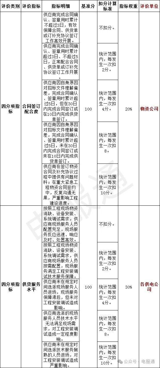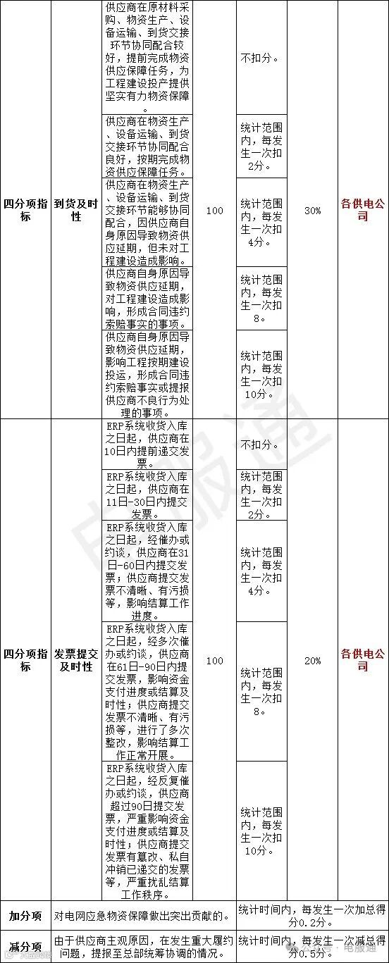 2、各供电公司负责“供货服务水平、到货及时性和发票提交及时性”等三项指标(以下简称三项指标)扣分统计。分别按照指标计算扣分标准(见各指标明细和分值表)统计数据范围内出现的扣分项和次数,计算得到各供应商各品类三项指标的扣分值,并记录对应的总评价数(以订单号为维度统计)。