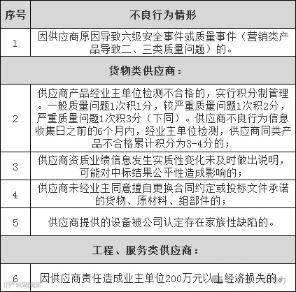 各单位实施招标采购范围的供应商不良行为,在总部供应商不良行为处理信息公示之前6个月内(以各单位供应商不良行为处理公布日期为准),供应商被任何1家单位列入黑名单的,或同一供应商同类产品因质量问题被2家及以上单位暂停中标资格,由总部做出扩大处理决定,并在公司系统内执行。各单位自行制订抽检规范的产品,因抽检质量问题被暂停中标资格的,总部不做扩大处理。