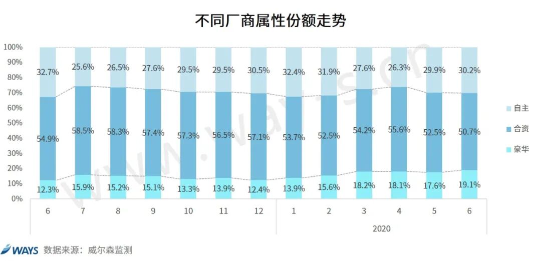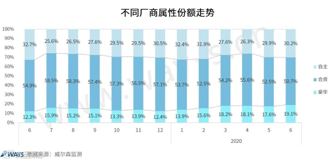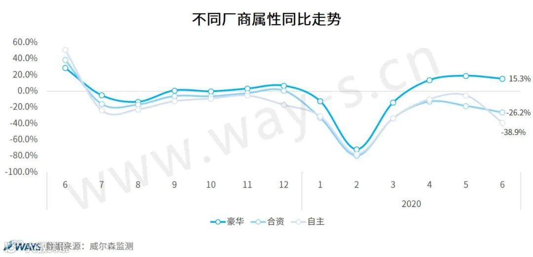 6月豪华车零售份额继续上升至19.1%,从同比增速上看,合资、自主在高基数对比影响下双线下滑,而豪华品牌逆势实现15.3%的正增长。在消费升级的高端增换购需求和豪华品牌价格不断下探的刺激下,豪华车市场迅速回暖,相反,自主品牌增长压力较大,同比下跌近四成。