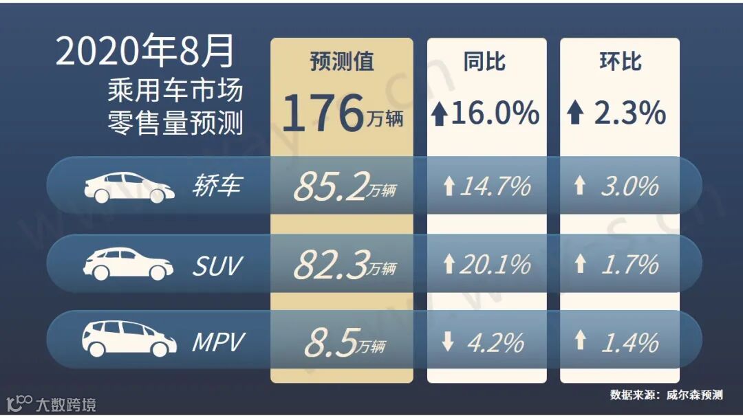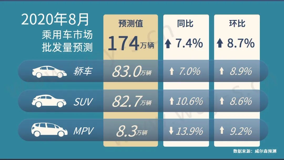 根据威尔森预测,2020年8月整体乘用车市场批发量预计为:174万辆,同比2019年8月上升7.4%。