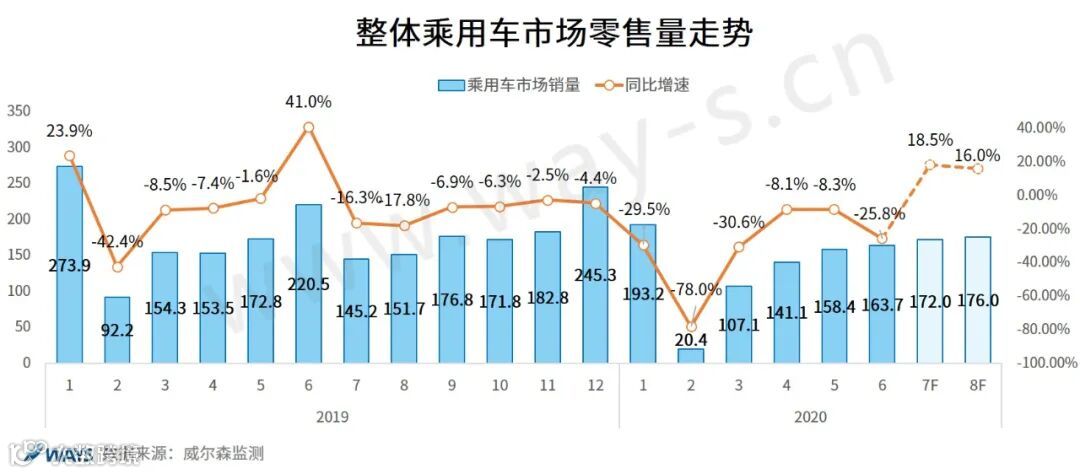 根据威尔森预测,2020年8月乘用车市场预测零售量为176.0万辆,同比上升16.0%,环比上升2.3%。