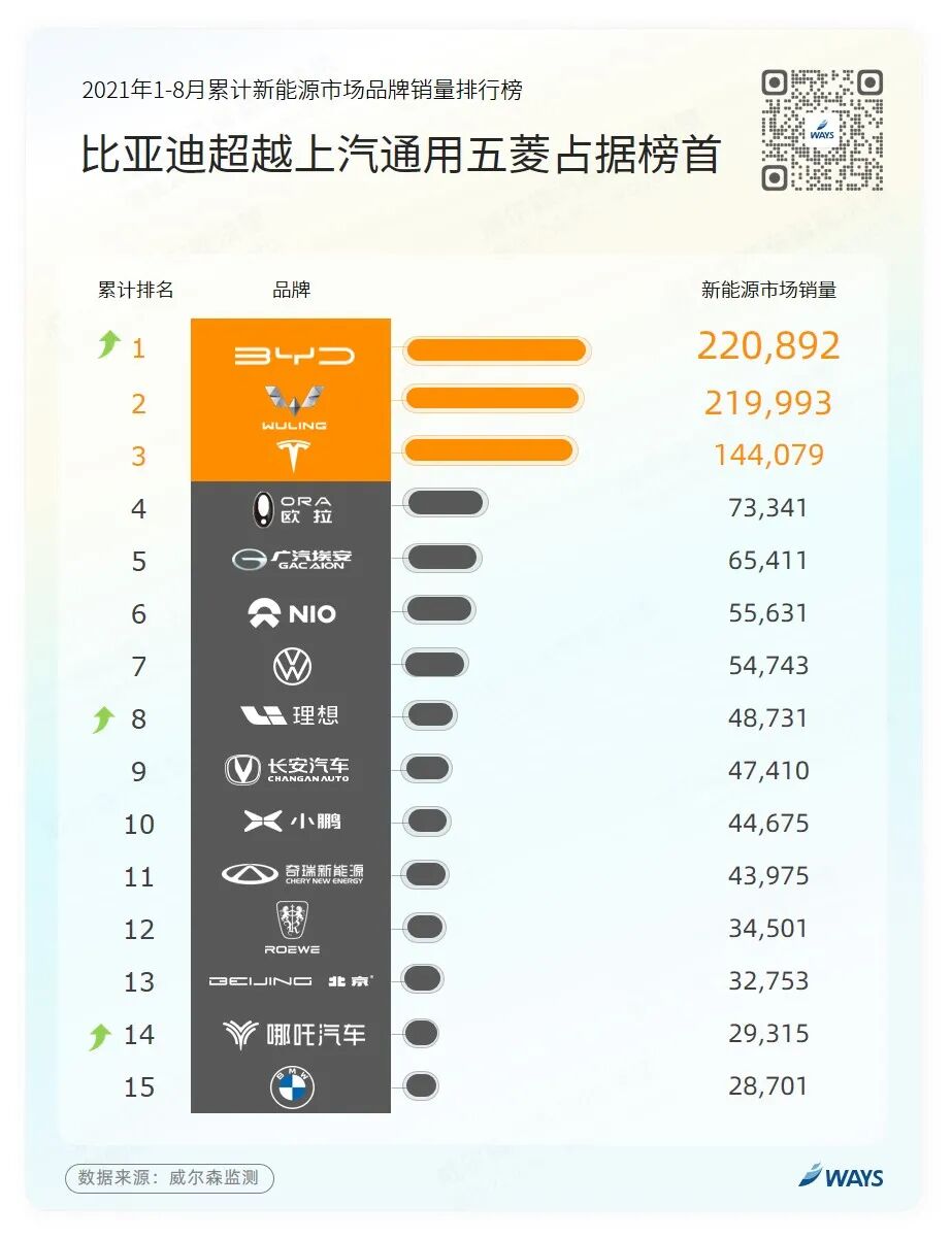 8月,宏光MINI EV销量继续领先,较7月稳步上升。另外,8月比亚迪多车型全面开花,作为比亚迪旗下首款搭载DM-i超级混动系统的车型,自今年1月上市以来秦Plus DM-i销量直线飙升,8月更是突破万辆,位居新能源榜单第二名。