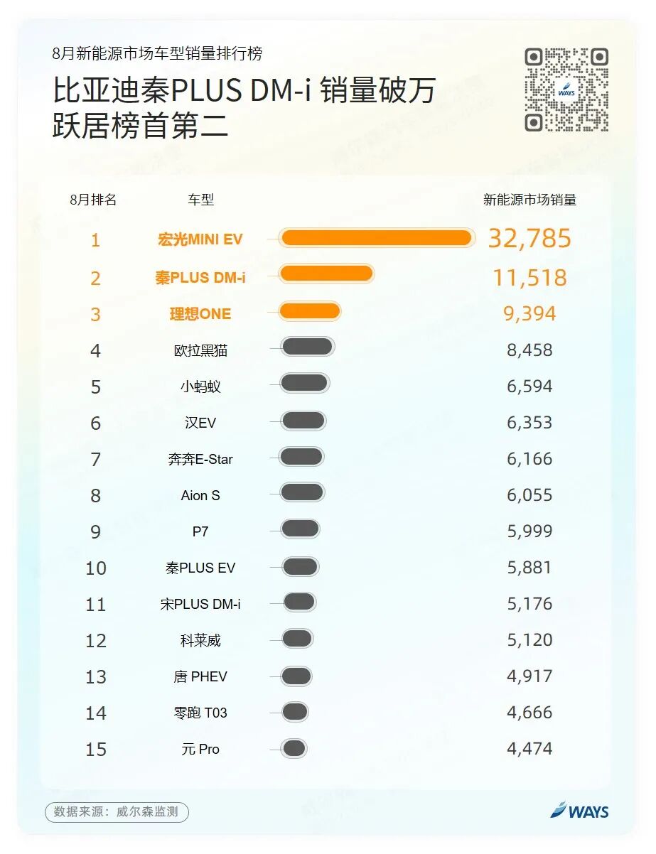 除此之外,秦PLUS EV、汉EV、宋PLUS DM-i、唐 PHEV以及元Pro几款车型均入榜销量TOP15。其它车型方面,理想ONE 8月增势凶猛,销量达9,394辆。