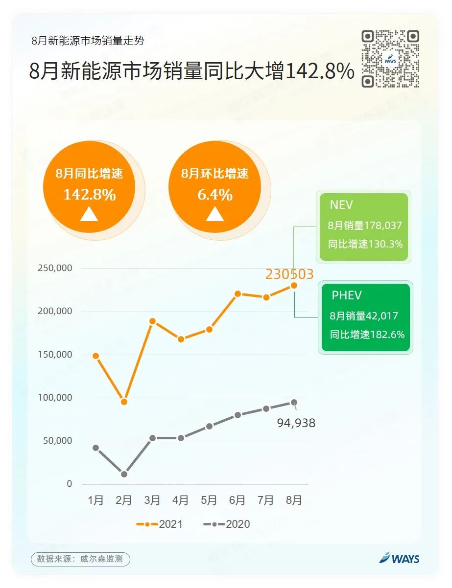 据威尔森智能决策支持系统监测,8月新能源市场销量约为23万辆,同比增加142.8%。其中,纯电动销量约17.8万辆,同比增加130.3%;插电混动销量约4.2万辆,同比增加182.6%。