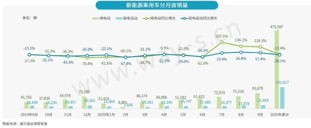 9月新能源市场销量约为11.5万辆,环比增长23.5%,同比增长91.6%;2020年1-9月累计销量60.7万辆,累计同比下滑15.0%;9月纯电动销量约9.4万辆,同比增长124.3%;插电混动销量约2.2万辆,同比增长17.4%。