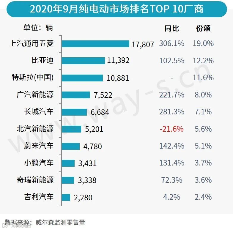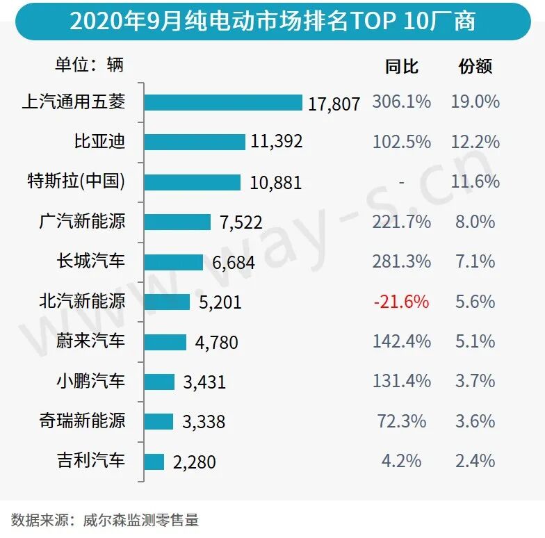 9月,纯电动市场前10厂商市场份额约为78.3%;上汽通用五菱销量稳居榜首,比亚迪小幅超越特斯拉(中国),位居第二。