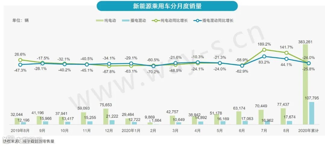 8月新能源市场销量约为9.5万辆,环比增长8.8%,同比增长115%;2020年1-8月累计销量49.1万辆,累计同比下滑25.4%。8月,纯电动销量约7.7万辆,环比增长9.9%;插电混动销量约1.8万辆,环比增长4.2%。