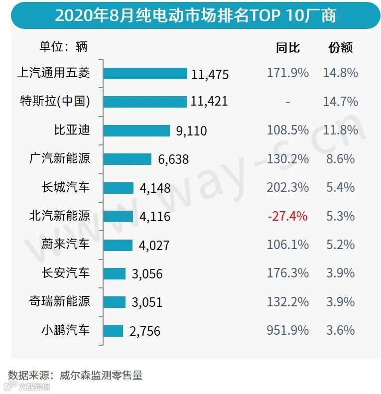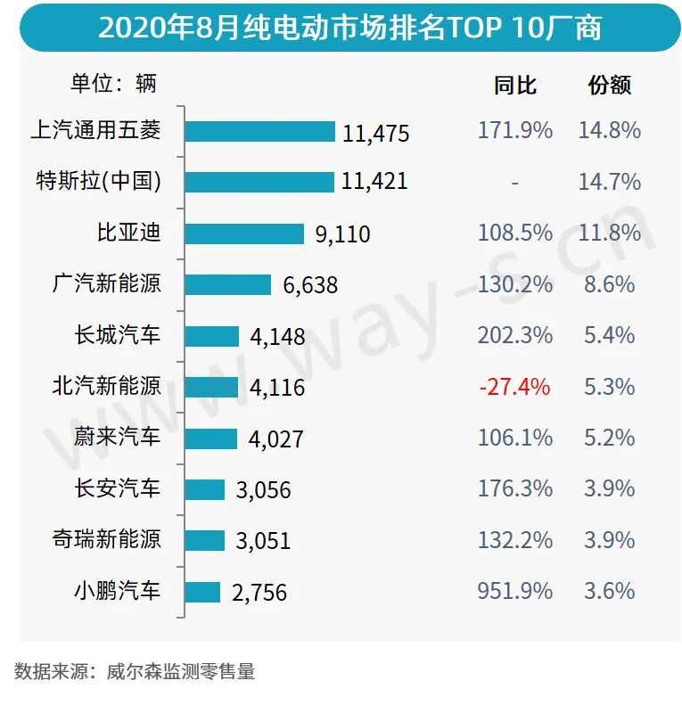 8月,纯电动市场前10厂商市场份额约为77.2%;上汽通用五菱销量超越特斯拉(中国) ,以小幅优势领先,夺得榜首;长城汽车排名上升至第五。