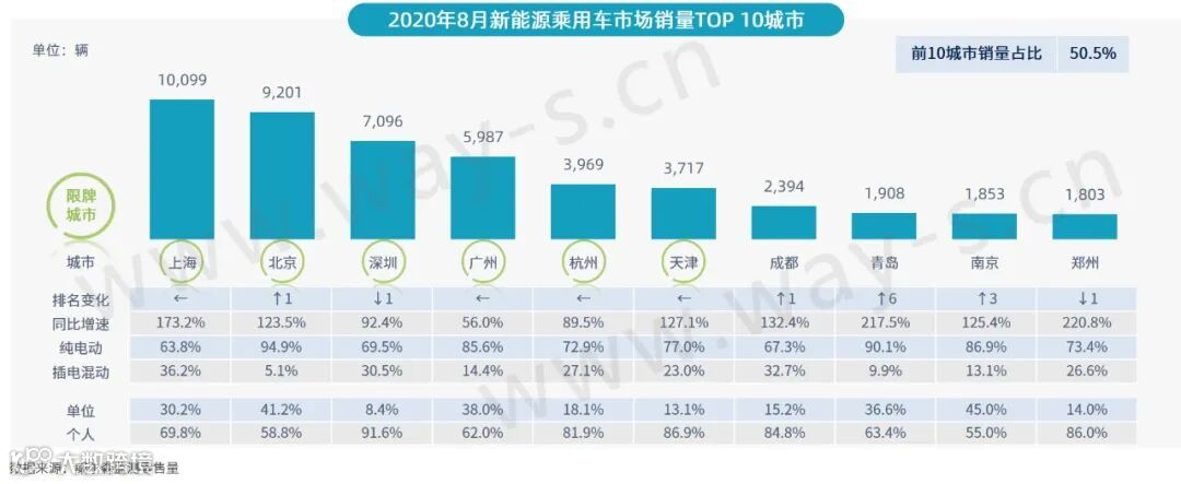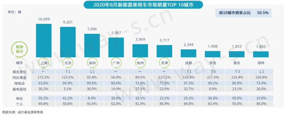 8月,前10城市销量占比为50.5%;限牌城市销量排名靠前,北上广深位列前四,上海销量破万继续领跑;青岛排名上升6位,跻身第八。