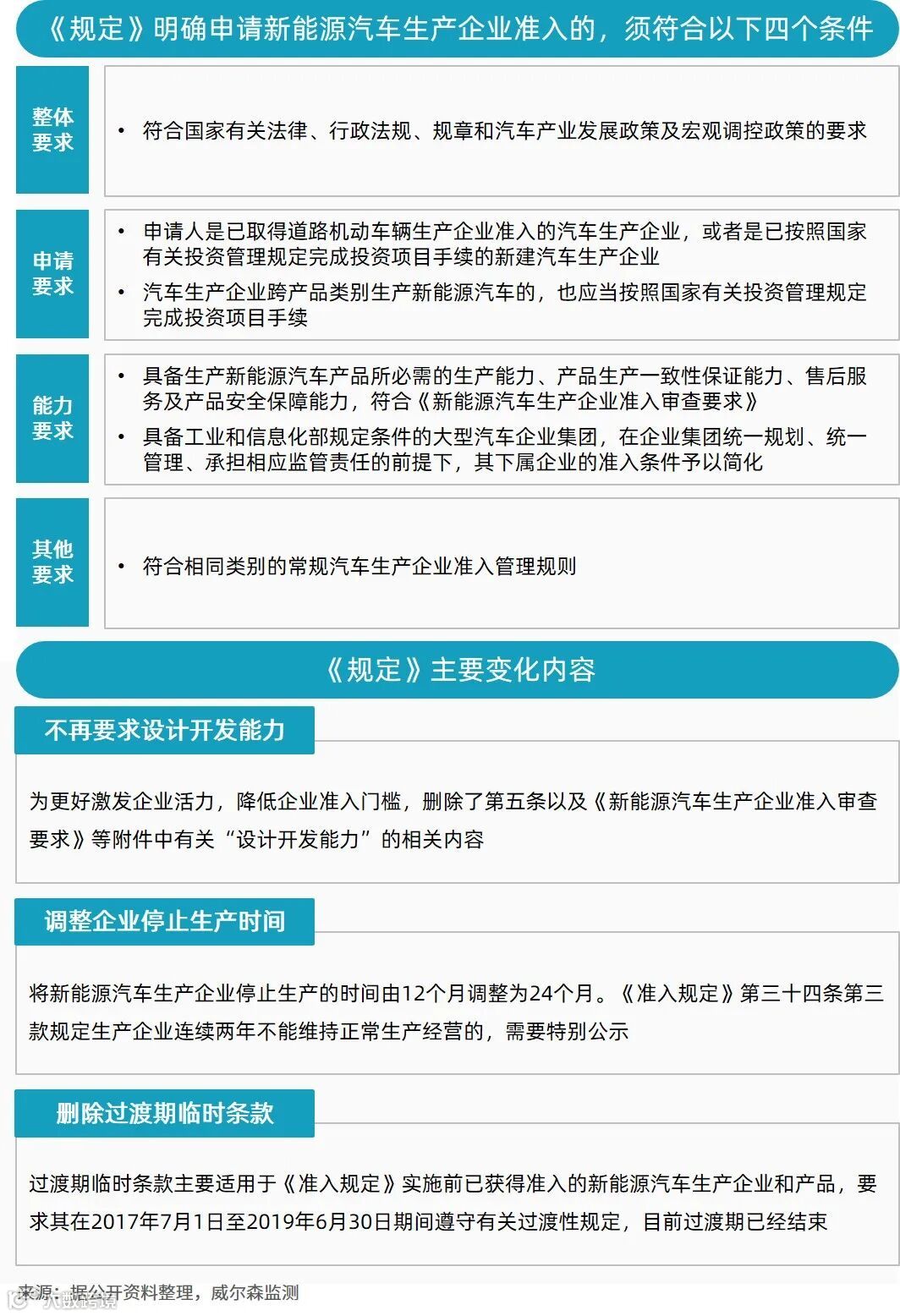 8月19日,工业和信息化部发布了《新能源汽车生产企业及产品准入管理规定》;与此前相比,本次《规定》大幅降低了行业准入门槛,有助于规范新能源汽车生产活动,促进新能源汽车产业持续健康发展;新政策于2020年9月1日起正式实施。