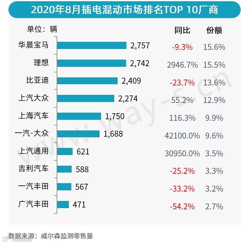 8月,华晨宝马占据插电混动市场厂商销量首位,理想紧随其后;理想ONE月销量超越5系 Le ,再夺插电混动市场车型销量排名榜首,累计市场份额进一步扩大。