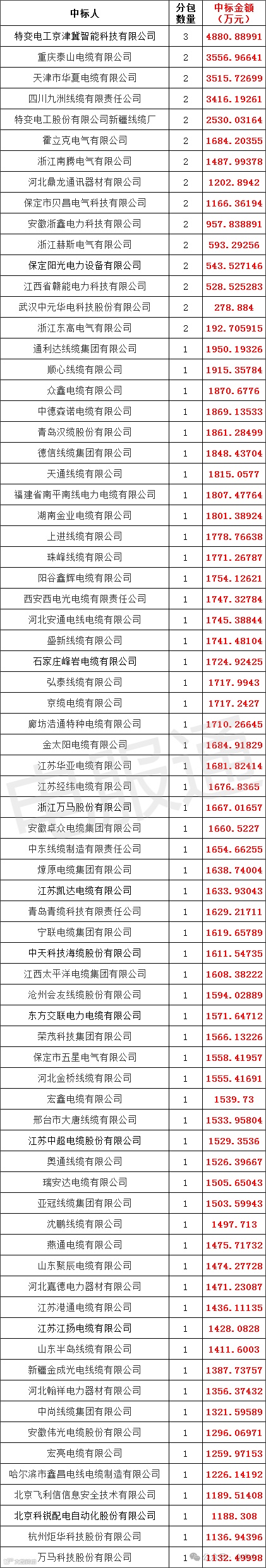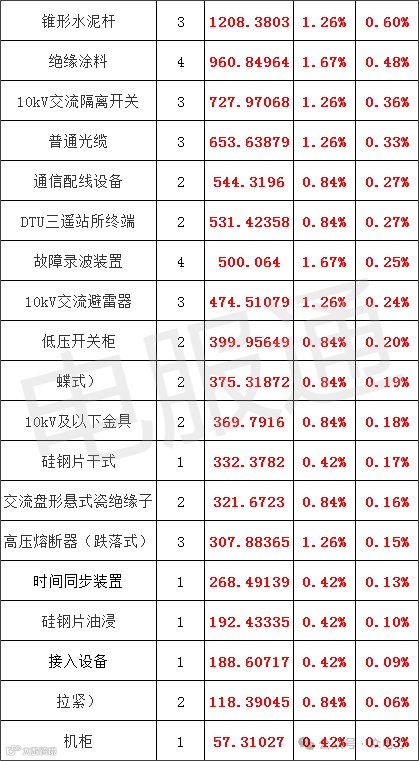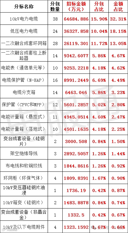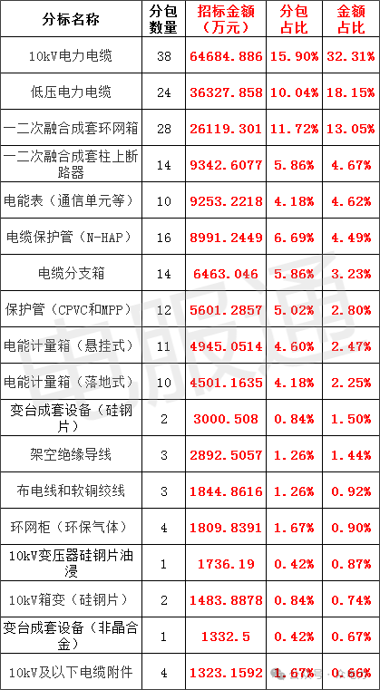 招标金额前三的是:10kV电力电缆64684万元,低压电力电缆36327万元,一二次融合成套环网箱26119万元;