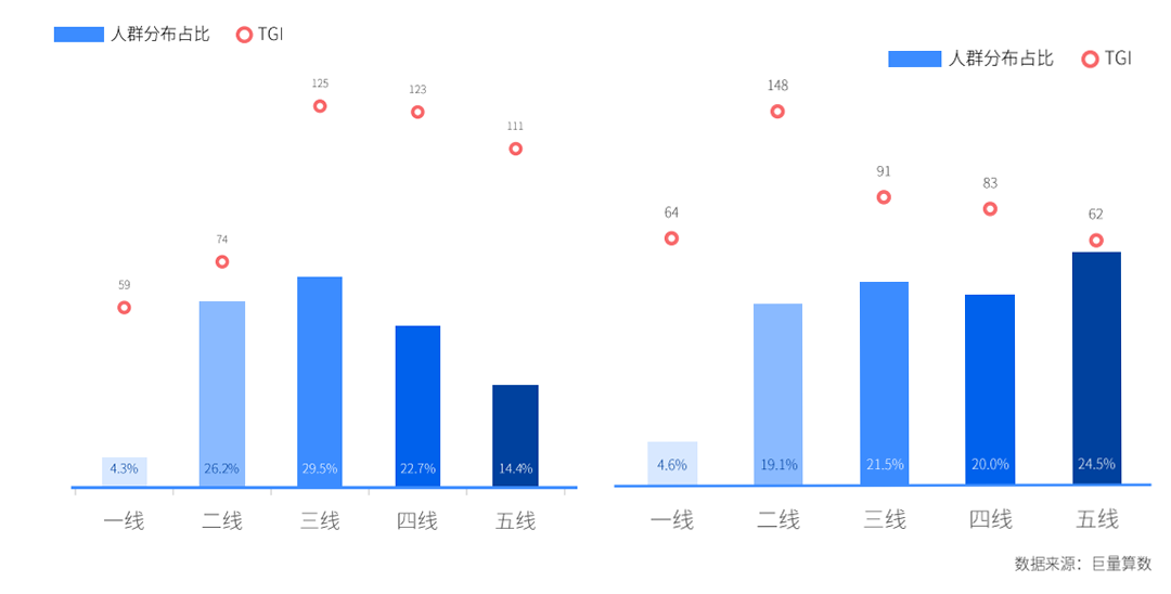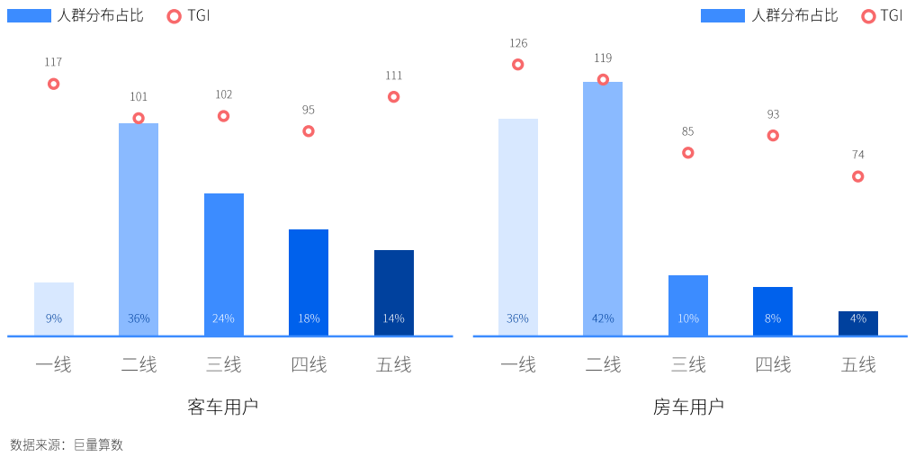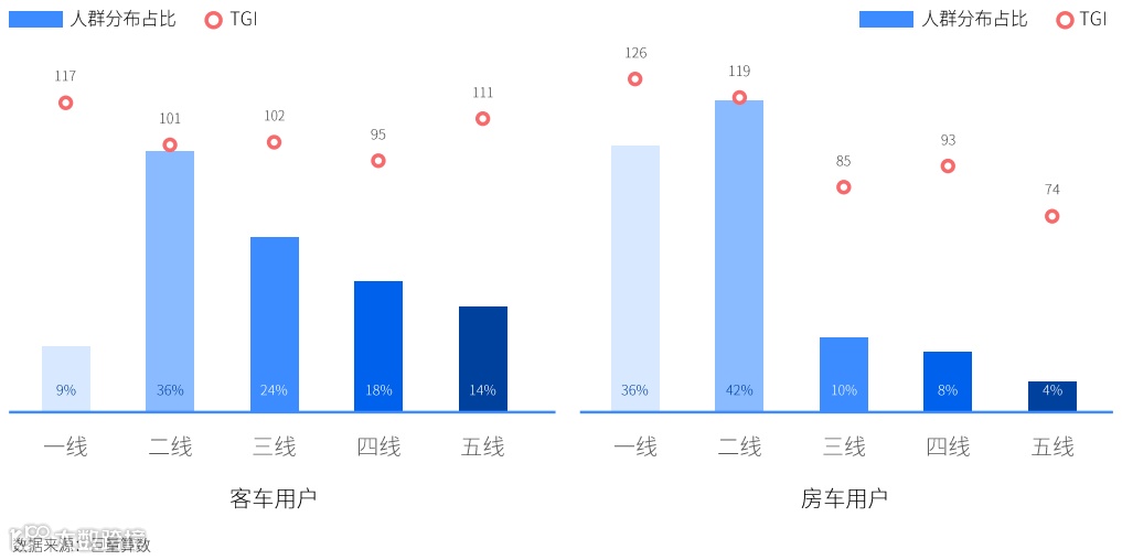 城市线级分布各有千秋。货车兴趣人群在三四线城市占比均超过20%,且未来有巨大潜力。而二线城市皮卡用户的潜力较大,客车用户主要分布在二三线城市,房车用户分布主要集中在一二线高线级城市。