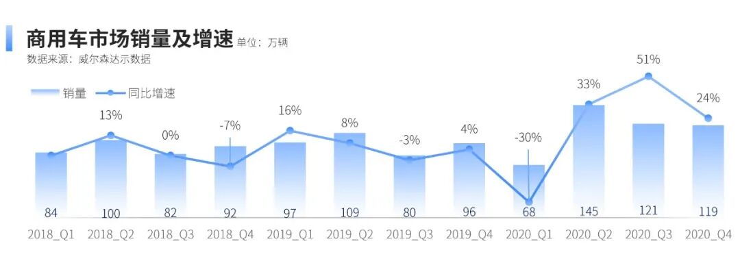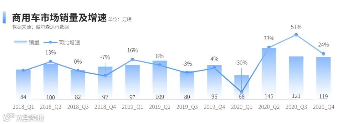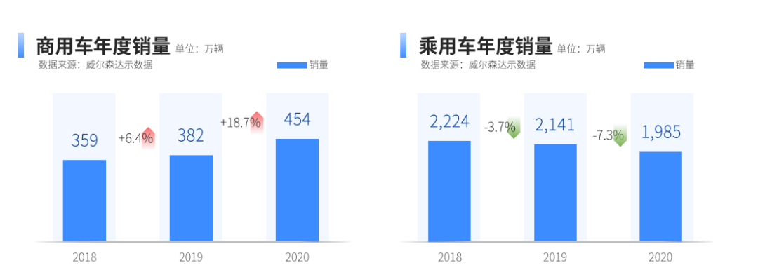 引言:2020年,是中国汽车市场极不平凡的一年,在疫情影响和经济下行的双重压力下,整体汽车市场复杂严峻,尽管下半年需求反弹,但整体依旧呈现负增长。根据达示数据显示,2020年乘用车销量下降7.3%;而商用车市场在政策、产品、营销等多方面因素的共同加持下,呈现逆势上扬,全年销量增长18.7%,是目前处于存量竞争中市场的亮点之一。