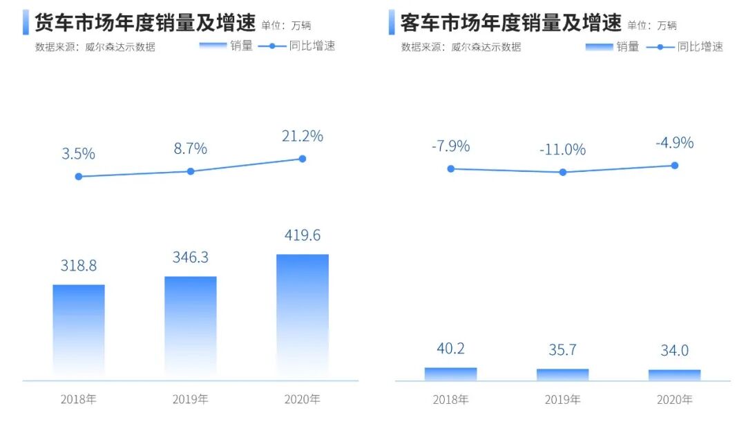 从细分市场来看,货车仍是支撑商用车持续高增长的主要市场。2020年货车销量为420万辆,同比大涨21.2%;客车销量仅为34万辆,同比下降4.9%。